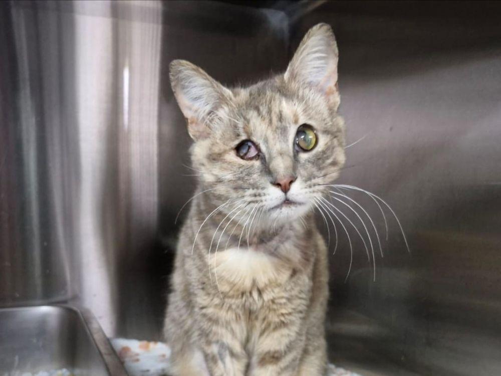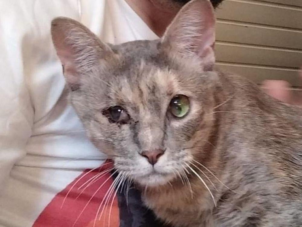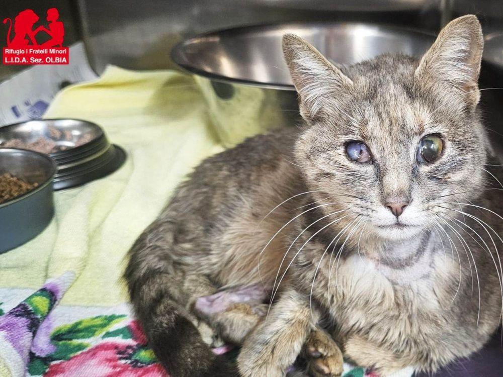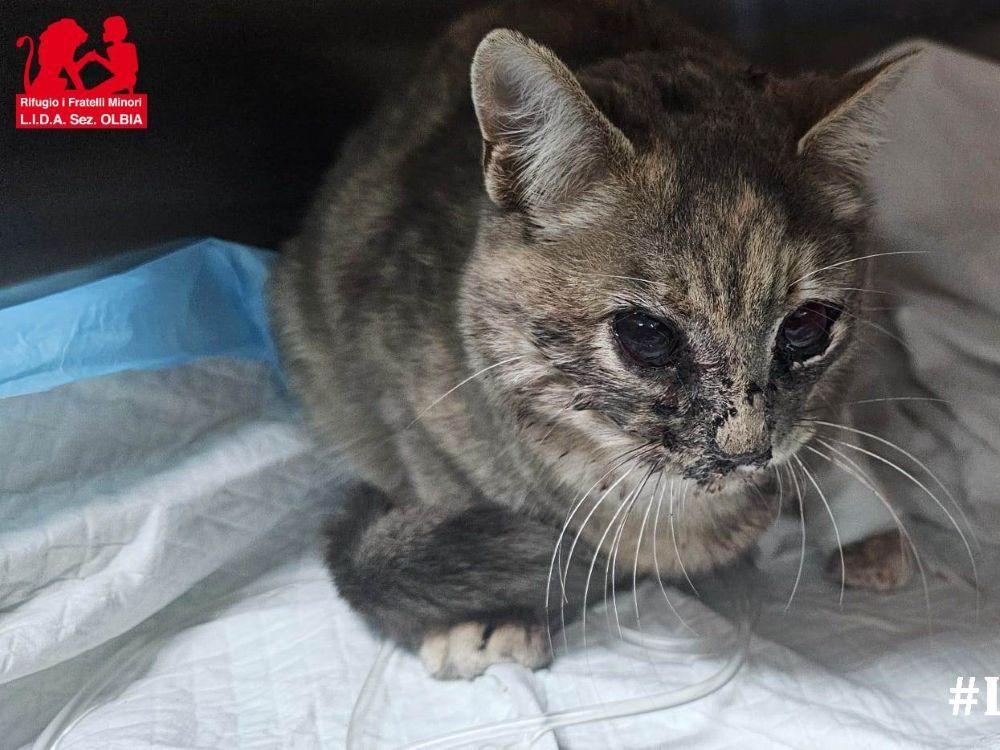 Elba wurde im März diesen Jahres in dunkelster Nacht von lieben Menschen auf Sardinien gerettet, sie lag angefahren mitten auf einer Straße. Sie war in einem sehr kritischen Zustand und musste sofort in eine Tierklinik. In ihrem zarten Gesicht waren beinahe alle Knochen gebrochen und die Augen waren aus den Höhlen getreten. Mit diesem schweren Schädeltrauma blieb die kleine, neun Monate alte Katze drei Wochen in der Klinik, wurde in der Zeit durch eine Magensonde ernährt, und als sie stabil genug war konnten die Tierärzte ihre Gesichtsknochen richten und auch die Augen wieder an ihren Platz bringen.