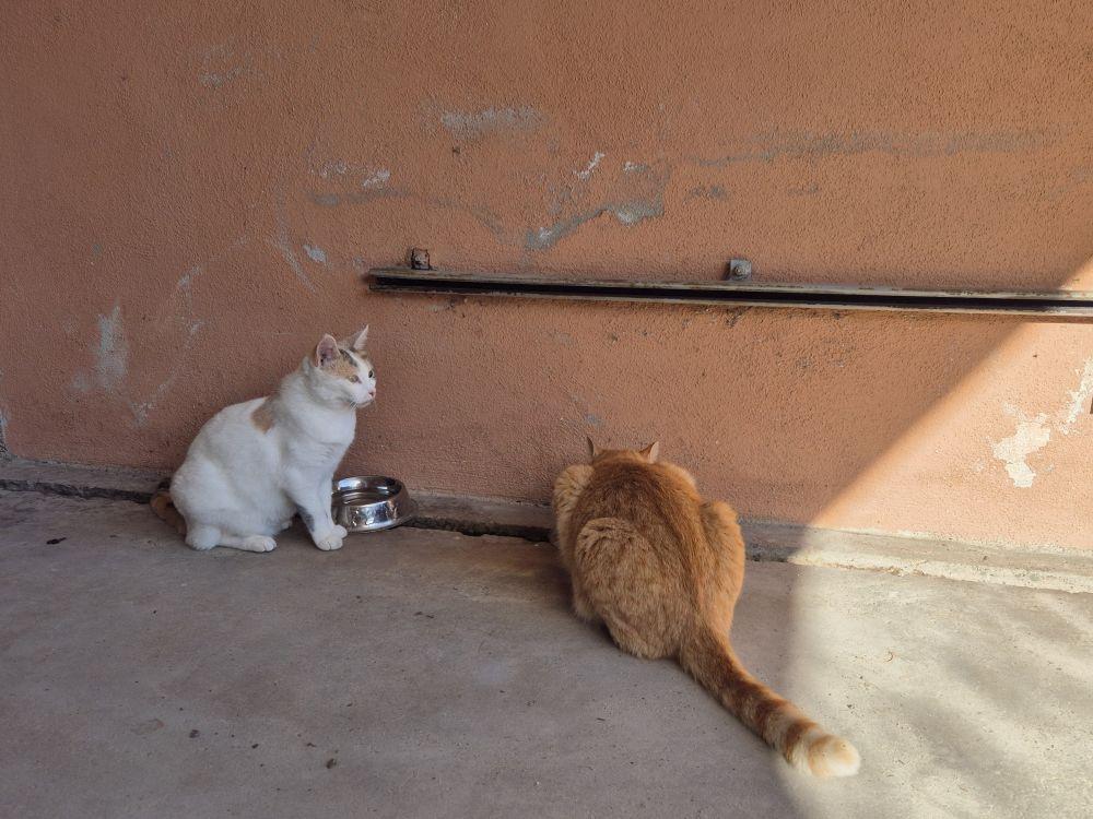 Die Katzen kennen diese festen Zeiten seit Jahren und warteten meist schon, als wir dort ankamen. An jeder Futterstelle gibt es Behältnisse für frisches Wasser, das täglich gewechselt wird, und die Katzen bekommen alle Nassfutter sowie eine Ration Trockenfutter.