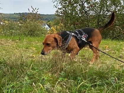 Deine Spaziergänge sind kleine Abenteuer. Schon das Anziehen des Sicherheitsgeschirrs ist für dich ein einziges Fest voller Vorfreude – du kugelst dich begeistert hin und her, bis wir es mit viel Lachen endlich geschafft haben. Im Auto fährst du gerne mit, denn das bedeutet meistens: Wald, Natur, Freiheit! Dort wirst du ganz zum Dackel – schnüffeln, buddeln, entdecken, mit glänzenden Augen und voller Lebensfreude, allerdings alles nur an der Schleppleine, mein großer Jäger.