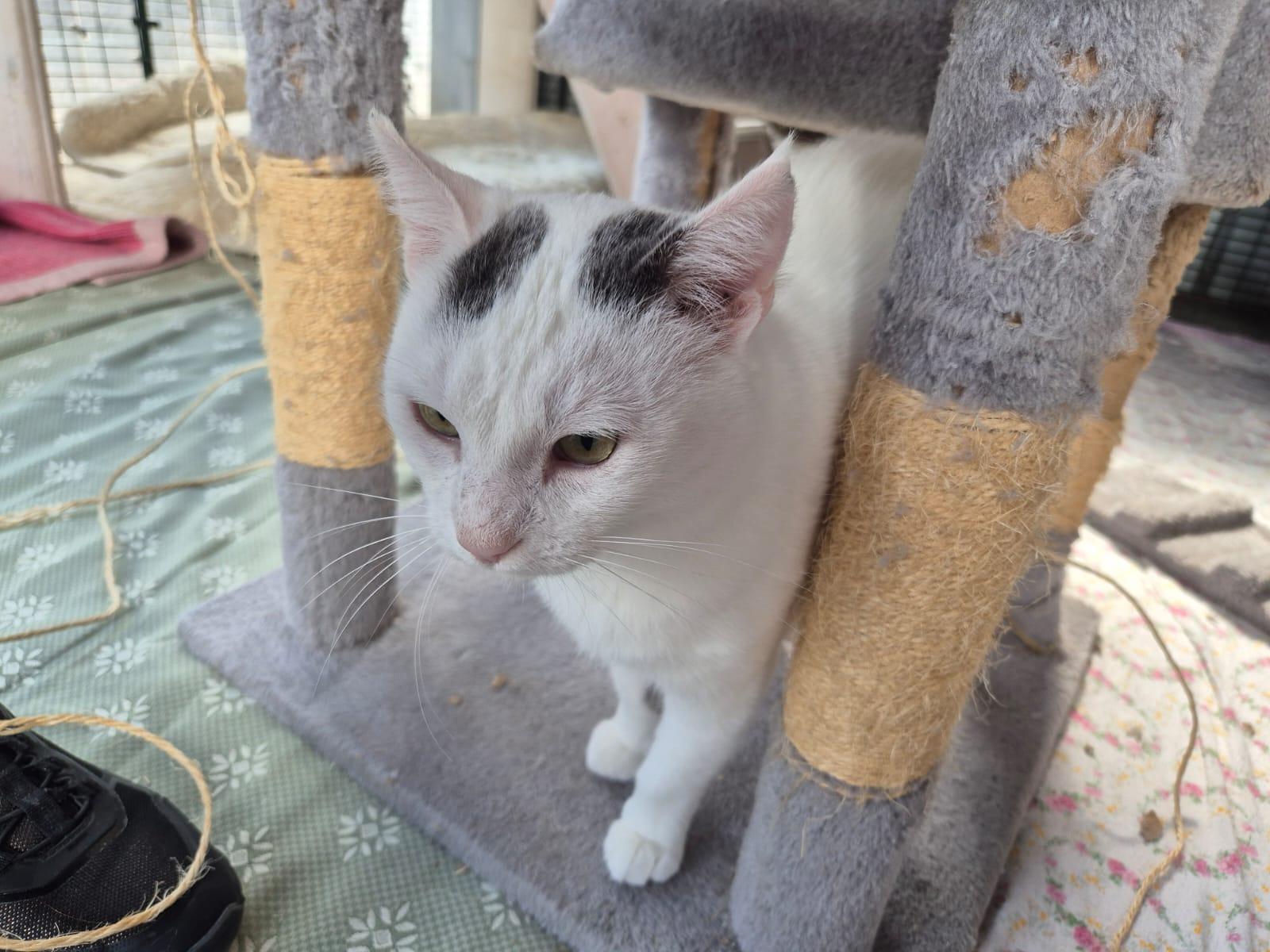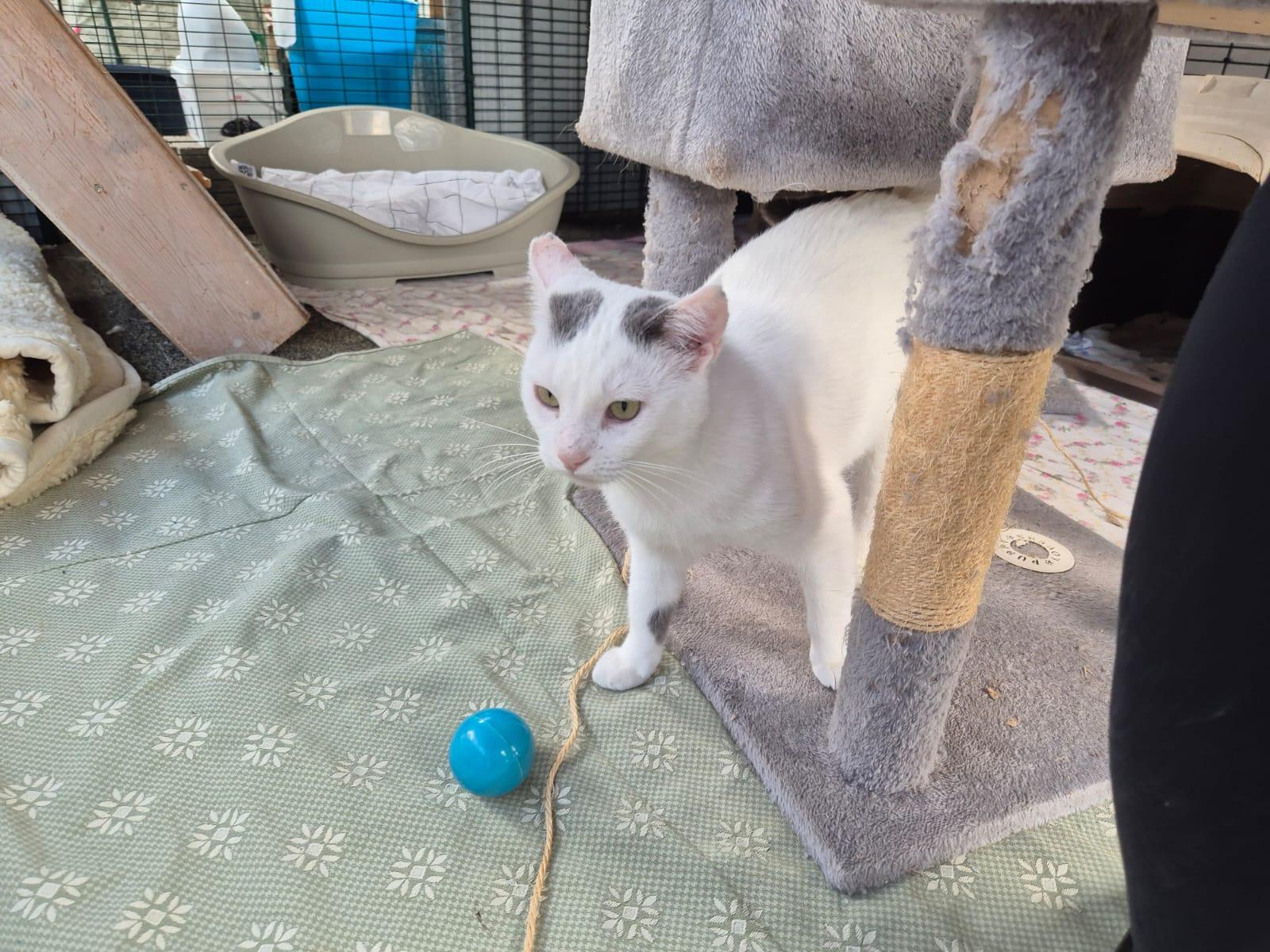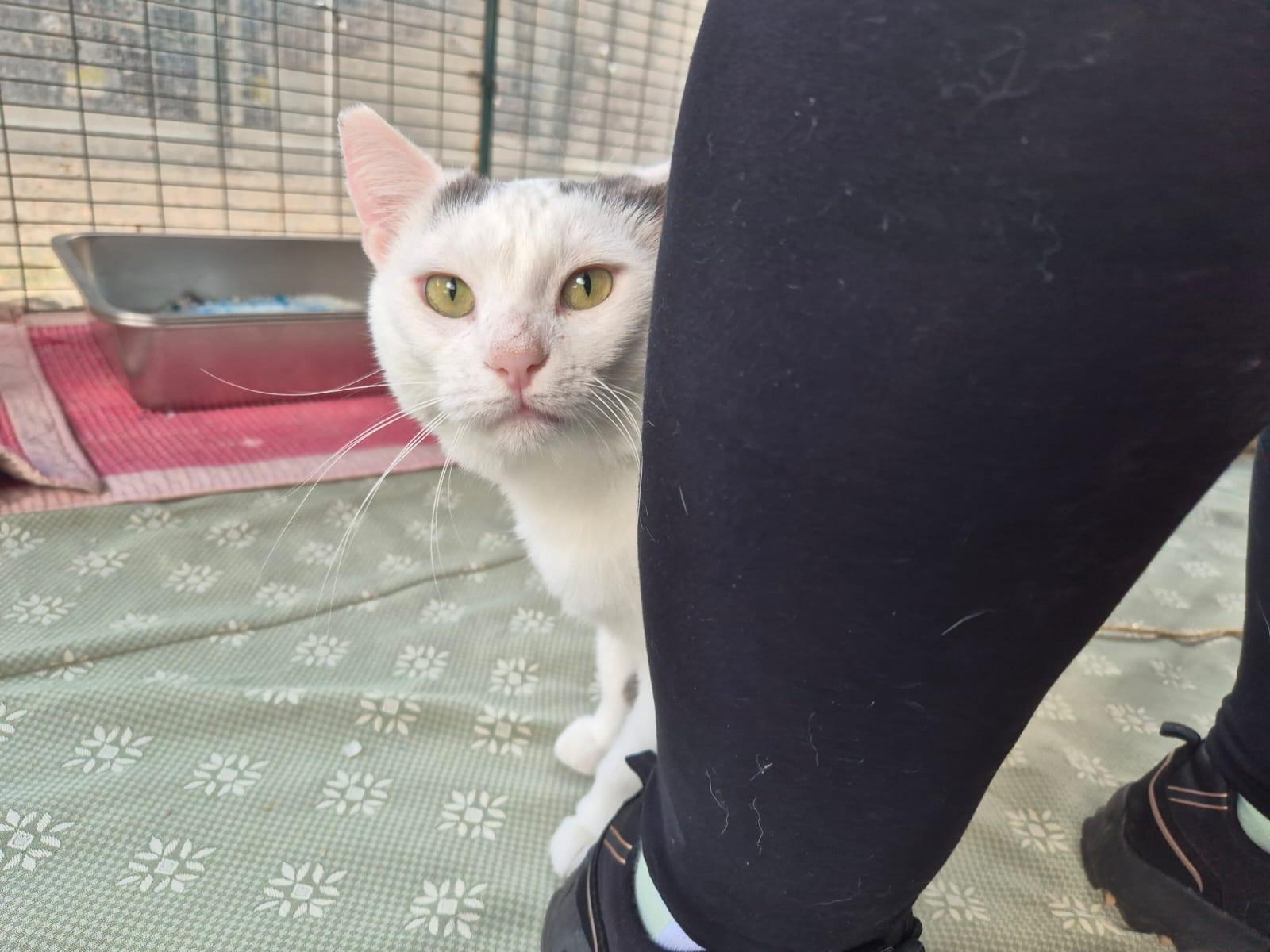 Bianchino wurde Mitte April 2024 in sehr schlechtem Zustand auf der Straße gefunden. Er war stark abgemagert und voller Flöhe. Außerdem waren beide Ohren von innen schlimm entzündet. Bianchino kann allerdings vollständig hören und durfte in der Zwischenzeit auch zu den anderen Katzen ins große Gehege umziehen. Hier zeigt er sich unaufdringlich und sozial.