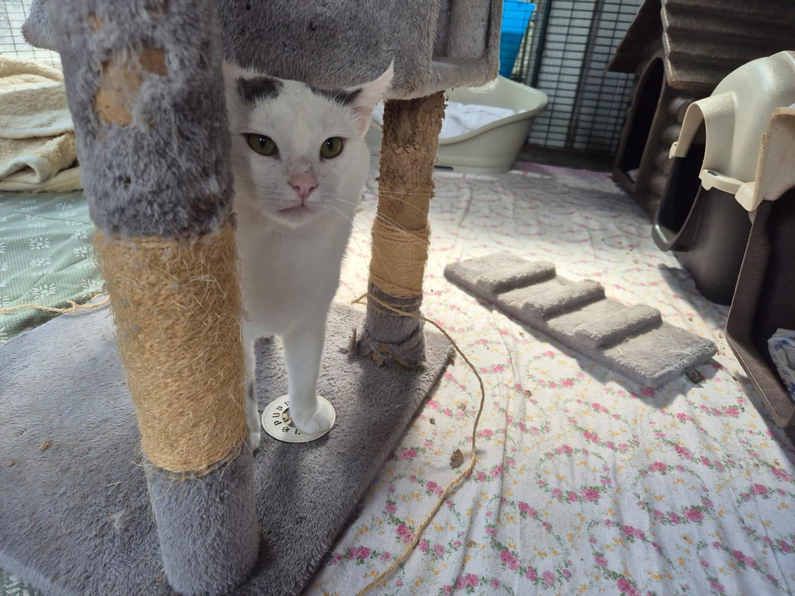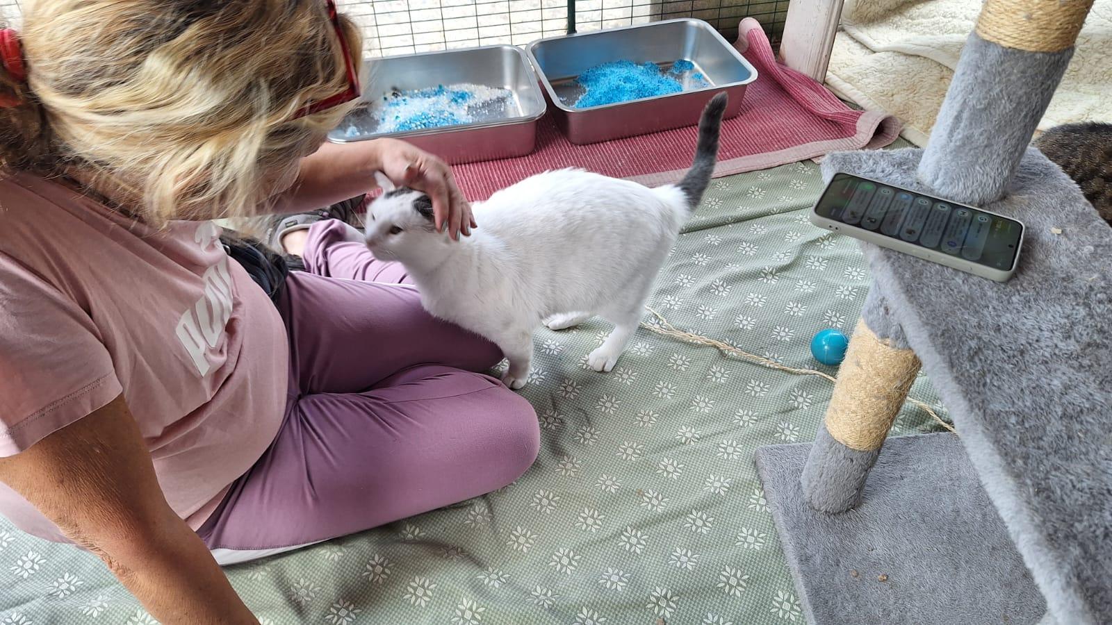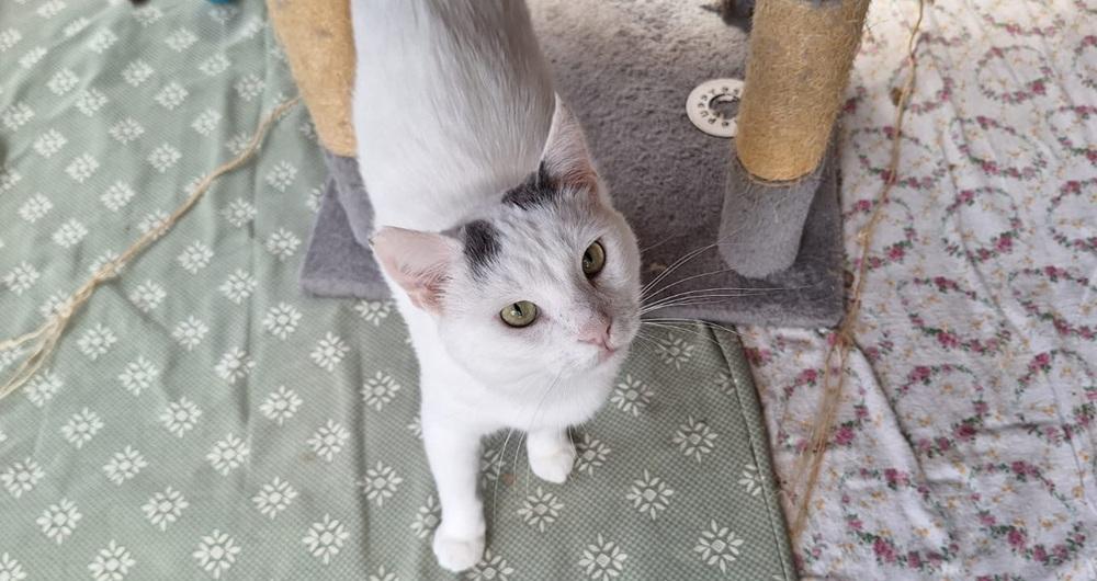 Bianchino wurde Mitte April 2024 in sehr schlechtem Zustand auf der Straße gefunden. Er war stark abgemagert und voller Flöhe. Außerdem waren beide Ohren von innen schlimm entzündet. Bianchino kann allerdings vollständig hören und durfte in der Zwischenzeit auch zu den anderen Katzen ins große Gehege umziehen. Hier zeigt er sich unaufdringlich und sozial.