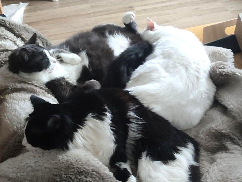 Unser hübscher Halblanghaar-Prinz Suri hat sich gut auf seiner Pflegestelle eingelebt. In den ersten beiden Wochen war er sehr unsicher und hat die beiden Kater angefaucht. Die haben jedoch große Geduld mit ihm bewiesen. Bianchino, Carlo und Suri sind mittlerweile zu einem klasse Trio zusammen gewachsen. Sie spielen, rennen, raufen und kuscheln miteinander und sind eine lustige Bande.